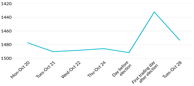 Maybe. The peso surged over nine percent on the Monday after the midterm elections (October 27, 2025). The gain steadily eroded during the next day as euphoria over the election subsided, replaced by the realization that Argentina has much to do to shore up its economy. Since the election to mid-November, the peso has traded in a range between 1400 and 1500 pesos to the dollar.