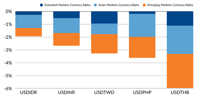 The alpha strategy’s best performers were our short US dollar positions against the Singapore dollar and the Norwegian krone and a long Australian dollar position v. USD (Figure 4).