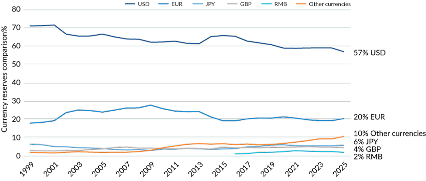 The euro continues to face structural challenges, including fragmented fiscal governance and periodic debt crises. The renminbi remains constrained by capital controls, limited convertibility, and uncertainty regarding state intervention in financial markets.