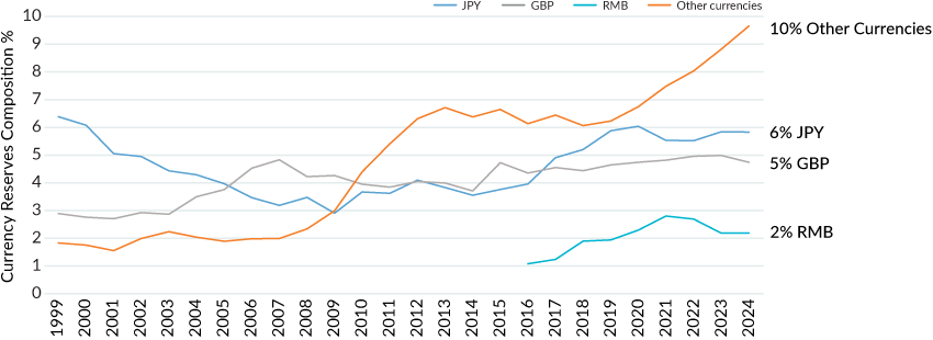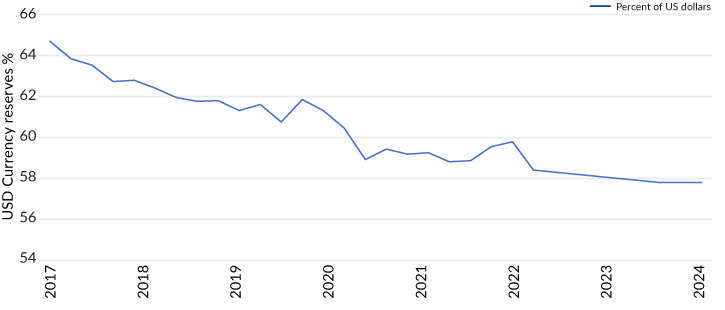 The Ukraine – Russia war is a new challenge to US dollar hegemony. The freezing of Russian assets (including currency reserves) was the end to Bretton Woods II, claimed Credit Suisse interest rates strategist Zoltan Pozsar, and the start of Bretton Woods III. Pozsar believed only the Chinese had the capability to supply financing to bridge the gap between Russian prices for energy (constrained by Western sanctions and price caps) and prices of energy provided by other suppliers. That unique role would offer an avenue for the Chinese to propel the renminbi into a dominant currency role. But the chaotic economic situation at the start of the war in February 2022 eased, and the currency reserve data through 2024 show the war has not been a world-altering event for the Chinese currency. The renminbi has been unable to take advantage of the US dollar's slow decline, staying below three percent of reserve currency holdings.