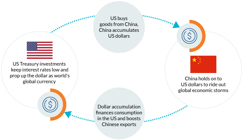 A pattern appeared: The US bought goods from these Asian countries who accumulated dollars, leading to an overvalued dollar and highly competitive currencies that boosted emerging market exports. That dollar accumulation helped reduce interest rates, financed deficit consumption by the US, and propped up the dollar as the world's global currency. This economic structure is often referred to as Bretton Woods II.3