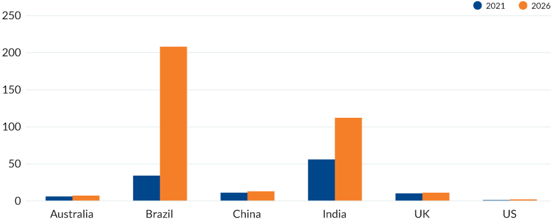 The GDP benefits (Table 3, Figure 3) result from an increase in real-time's share of the payment mix. In Brazil, CEBR expects the percentage of real-time payments to rise from 5.2% in 2021 to 34.3% in 2026. For India, the expected increase is from 31% to 71%. In the US, it's just 1% to 4%; CEBR projects Australia to move from 5% to 10% and the UK 9% to 12%.