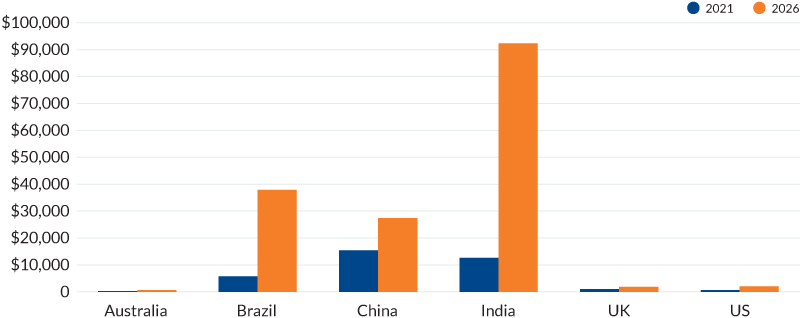 Table 2 and Figure 2 present these savings for the real-time payment leaders (India, Brazil, China) and developed countries that have modest real-time payment systems (Australia, United Kingdom, United States). The savings potential for India, Brazil and China in 2026 is substantial, approaching $158 billion. The savings are huge because they're paper-based nations with plans to shift a large percentage of their payment mix to an instant electronic system.