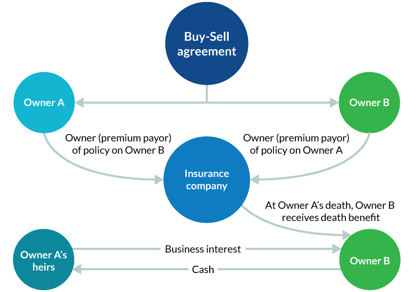 A buy-sell agreement can take different forms. A cross-purchase agreement involves an agreement between the owners which requires the remaining owners to purchase the interest of an exiting owner. Each of the remaining owners is financially responsible for the purchase of their pro rata share. If life insurance is used to fund the purchase after an owner's death, each owner will be required to purchase a policy on the life of every other owner, which can become burdensome when there are several owners.Ā